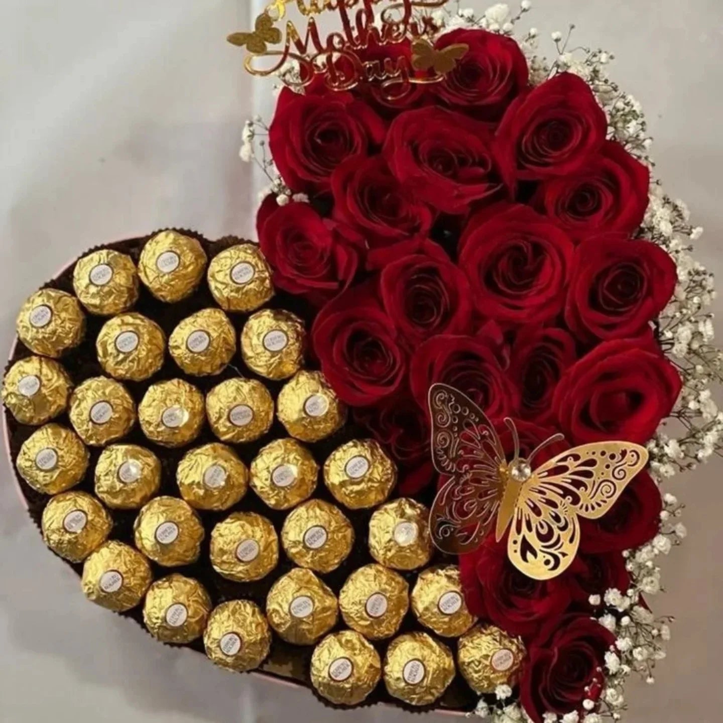 • A stunning heart-shaped box filled with luxurious red roses and decadent Ferrero Rocher chocolates.